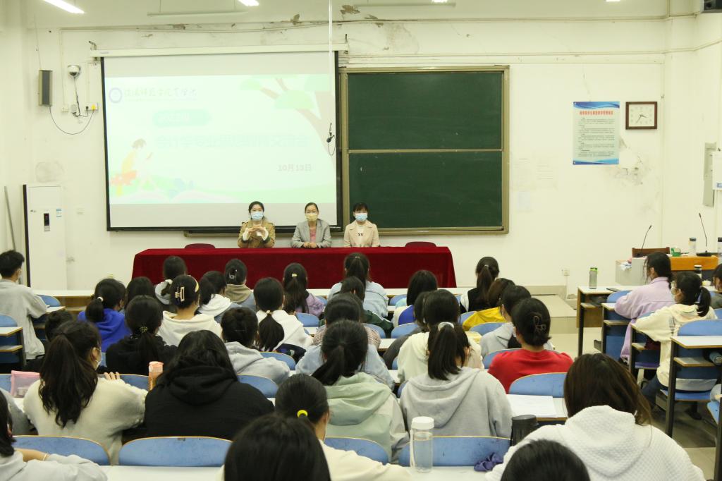 会议伊始,郭跃芳向大家介绍了会计学的专业优势和就业前景,极大地增强了同学们的专业认同感。同时,她指出会计学是一门综合性学科,具有很强的理论性、实践性和技术性,需要同学们合理规划大学生涯,科学高效地完成自己的本科学业。随后,郭跃芳为大家提供了本专业的一些学习方法、需要考取的证书以及未来的考研方向,并向同学们详细解释了学硕与专硕的区别。对于今后的专业学习,她向同学们提出了三点建议:一是要深刻认识到学位课程的重要性,注重提升自身的专业能力;二是要增强自主学习意识,给自己树立长期和短期目标,并不断努力实现;三是要注重自身兴趣、能力、人格等方面的培养,做“通才型”大学生。会议最后,会计学系老师朱倩、孙艳结合自身的学习经历,为同学们答疑解惑,希望大家在未来四年的大学生活中积淀自我、不断奋进,真正做到有所收获、有所成长。