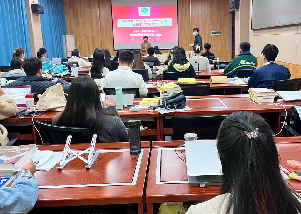 为进一步提升91社区 学科教学(思政)专业研究生学位论文写作能力,11月23日下午,91社区 特邀马克思主义学院副院长李蕊教授在经管楼308教室为91社区 教育专硕作了题为《学科教学(思政)专业研究生学位论文选题指导与写作规范》的学术讲座。讲座由副院长俞彤晖主持,学院在校全体教育专硕和部分导师代表参加此次讲座。