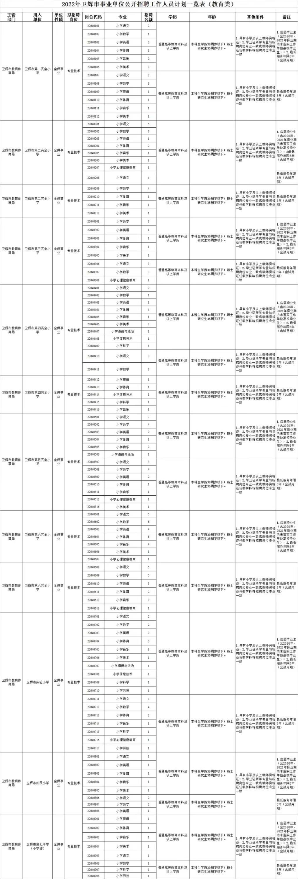 依据《事业单位人事管理条例》(中华人民共和国国务院令第652号)、《事业单位公开招聘人员暂行规定》(原人事部令第6号)、《河南省事业单位公开招聘工作规程》(豫人社〔2015〕55号)、《河南省人力资源和社会保障厅 关于进一步做好全省事业单位招聘高校毕业生工作的通知》(豫人社办函〔2022〕72号)及省市相关政策规定和要求,经卫辉市人民政府同意并报新乡市人力资源和社会保障局备案,拟面向社会公开招聘事业单位工作人员732人。现将有关事项公告如下: