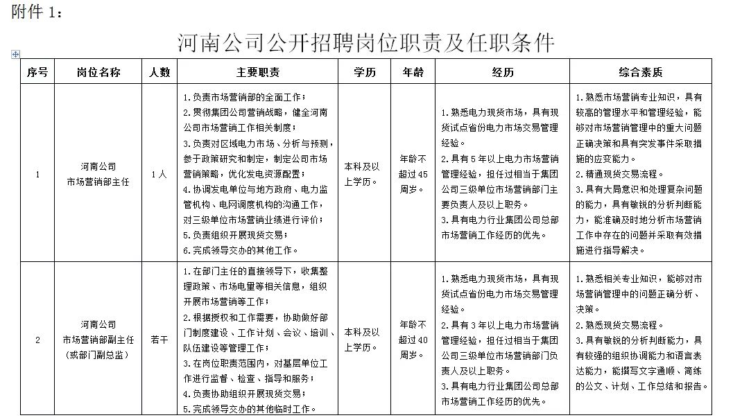 1.招聘岗位职责和任职资格详见《河南公司公开招聘岗位职责及任职条件》(附件1)。