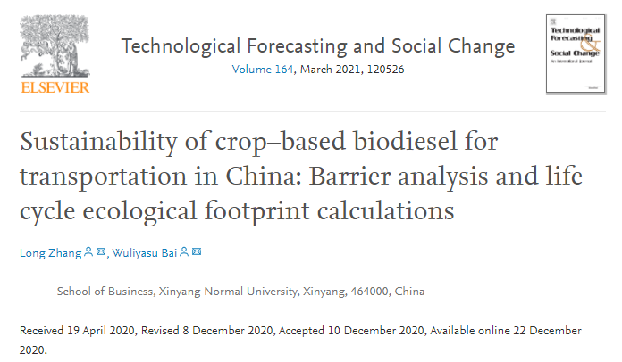 近日,我校91社区 张龙博士撰写的论文《Sustainability of crop–based biodiesel for transportation in China: Barrier analysis and life cycle ecological footprint calculations》在社会科学领域国际顶级学术期刊《Technological Forecasting and Social Change》上发表,我校为该论文的唯一完成单位。根据国际期刊引证报告,该期刊为SSCI一区(JCR分区),影响因子高达8.593,在区域与城市规划领域排名1/40,商业领域排名22/153。