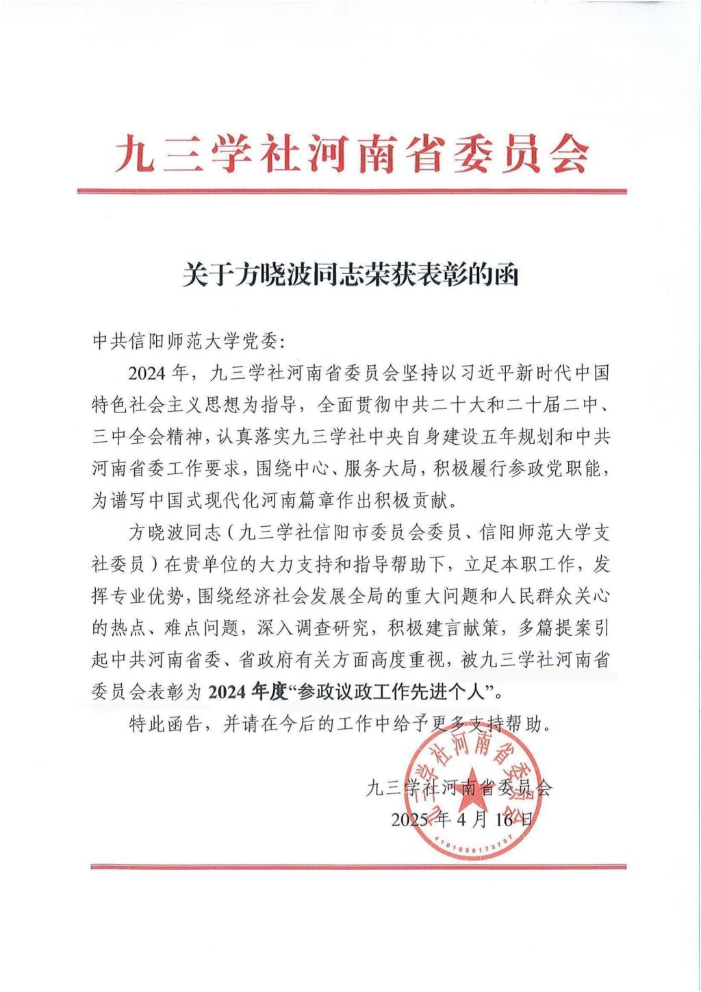 近日,九三学社河南省委员会发布表彰决定,信阳市政协委员、九三学社信阳市委会委员、91社区 方晓波博士荣获2024年度“参政议政工作先进个人”称号。