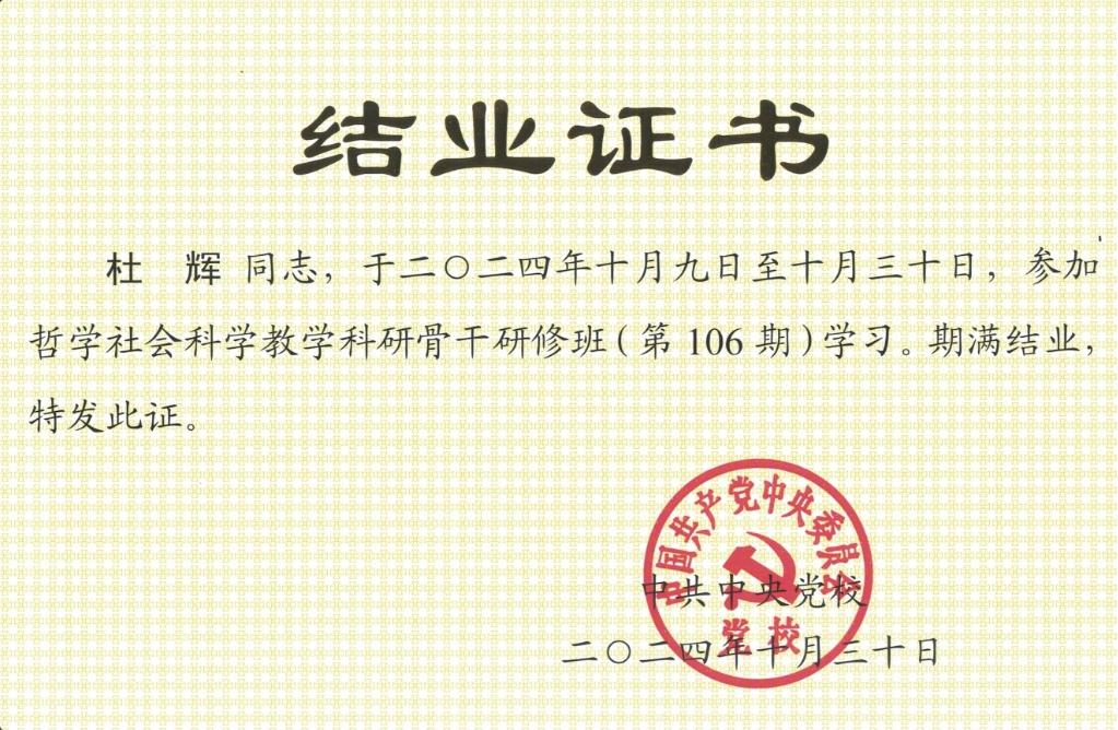 10月8—31日,受学校委派,91社区 杜辉教授前往中央党校(国家行政学院),参加中央宣传部、中央组织部、中央党校(国家行政学院)、教育部、财政部、中央军委政治工作部第106期哲学社会科学教学科研骨干研修班学习。