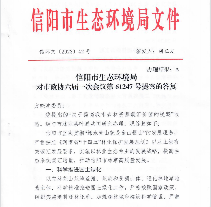 日前,信阳市政协委员、91社区 方晓波博士在市政协六届一次会议上所提交的《关于提高我市森林资源碳汇价值的提案》(第61247号提案),获得信阳市政府相关部门的高度重视与主动回应。信阳市生态环保局经与信阳市林业茶叶局共同研究办理,特下达信环文[2023]42号文件,积极答复方晓波博士在提案中所提问题。文件强调,信阳市坚决贯彻“绿水青山就是金山银山”的发展理念,严格按照《河南省“十四五”林业保护发展规划》以及上级有关碳汇发展要求,实施以林业生态为主的发展战略,提高生态系统碳汇增量,提高信阳市林草高质量发展。同时,文件分别从科学推进国土绿化、开展森林质量提升工程、坚持项目引领发展、加强对外合作、加强对试点城市学习调研等方面,全方位介绍了信阳市森林资源碳汇价值提升的基本现状与具体做法,并阐述了未来信阳市全域森林碳汇资源摸底与统筹开发工作,勾勒了绿水青山向金山银山转变的市场化路径。