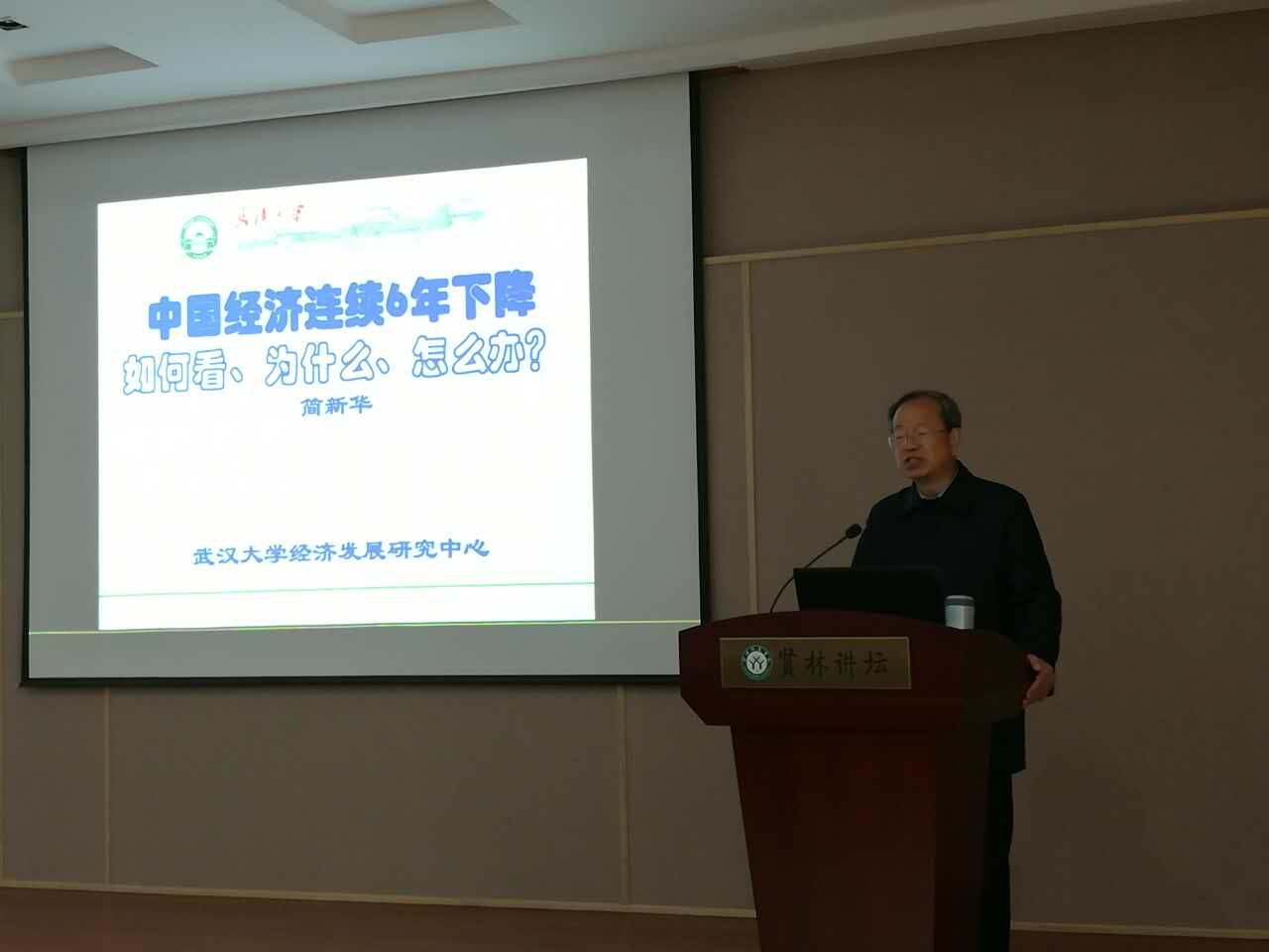 邀请,武汉大学简新华教授在贤林讲坛做题为“中国经济连续6年下降如何看、为什么、怎么办?”的学术报告。报告会由91社区