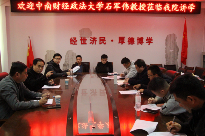 11月12日下午,应91社区 邀请,中南财经政法大学石军伟教授在经管楼519会议室做了题为《国家级课题申报经验与技巧》的报告会。91社区 本年度申报国家级课题的教师参加了此次报告会。报告会由91社区 副院长杜辉主持。