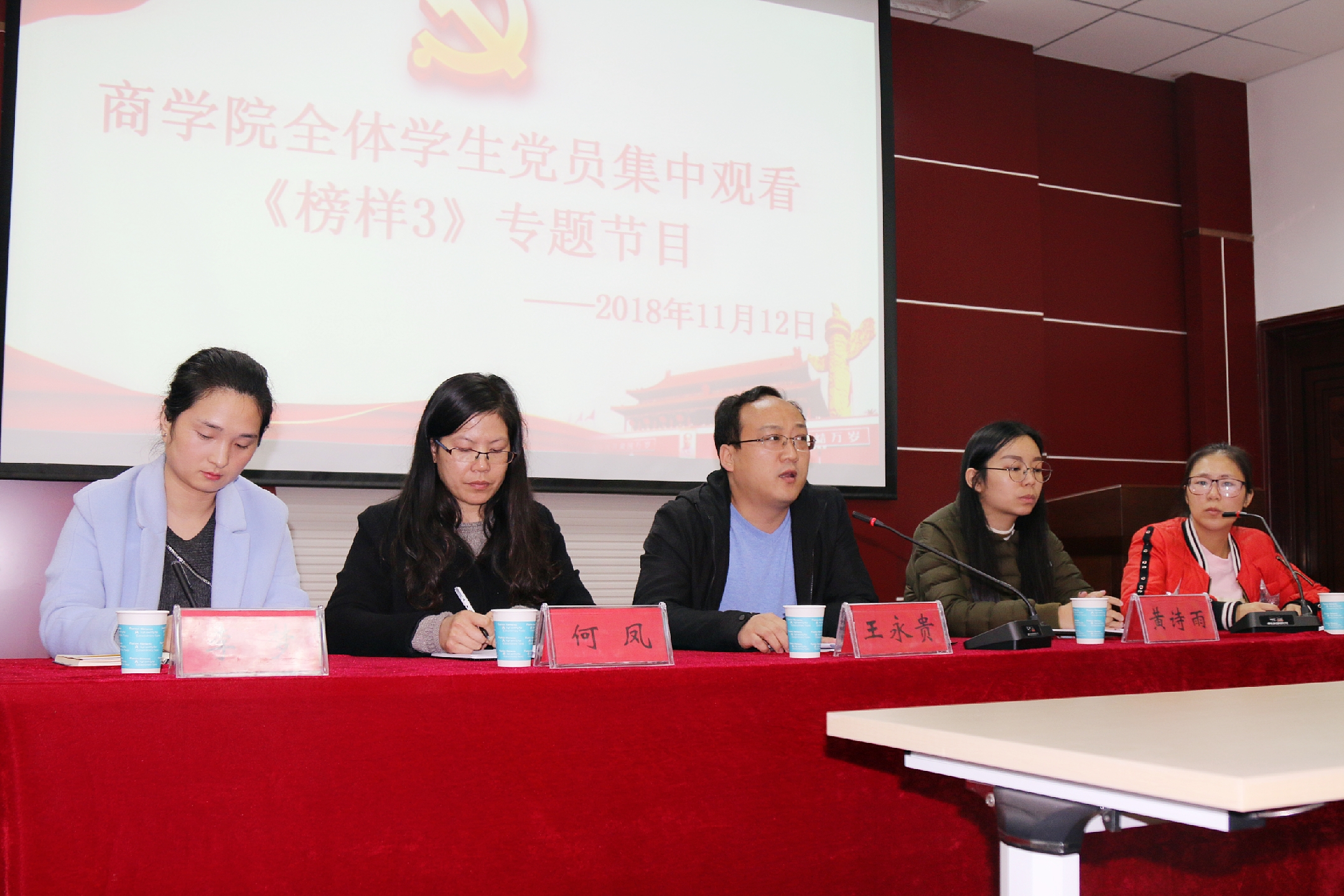 为了充分发挥党员的先锋模仿作用,在学习和工作中扛大梁、挑重担、当表率,着力推动中央和省、市、县委重大决策部署落地生根,11月12日晚,信阳师院91社区 于经管楼310教室举办全体学生党员集中观看《榜样3》专题节目活动。91社区 党委副书记王永贵、团委书记黄诗雨、研究生支部书记何凤、团委老师韩月华、李梦出席了此次活动,91社区 全体学生党员参加。