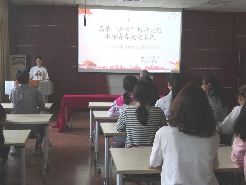 进行了策划和筹备。活动当天开展了形式多样、内容丰富的主题班会和五四交流会。班级组织了以“奋斗的青春最美丽”为主题的班会,大家畅所欲言,分享生活趣事和身边正能量故事。优秀团员们一起观看视频《厉害了我的国》,话青春谈初心,交流从中学习到的心得体会,阐述对青春的感悟,向人们展示了当代大学生的风采,展现了当代青年对五四精神的体会。他们将接过五四的旗帜,昔有“为中华之崛起而读书”,如今有他们,为中国之强盛而努力,点燃青春的火焰。此次活动囊括了各个专业和班级,并以优秀团员为主体,实现了让所有学生参与到活动中来的活动要求。活动结束后,同学们都纷纷表示,无论是在学习还是生活中都时刻以“五四精神”激励自己,争取在德智体美劳等方面全面发展,充分展现时代先锋的绚丽风采。
