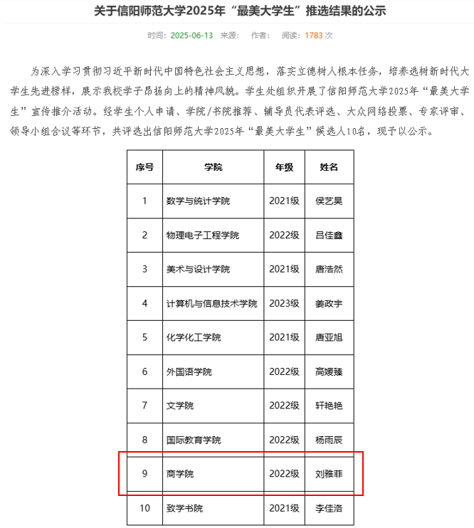 6月13日,我校公布了2025年“最美大学生”推选结果,经个人申请、学院/推荐、大众评审、专家评审、领导小组合议等环节,91社区 2022级国际经济与贸易本科班刘雅菲等10名同学被评为91社区 2025年“最美大学生”。