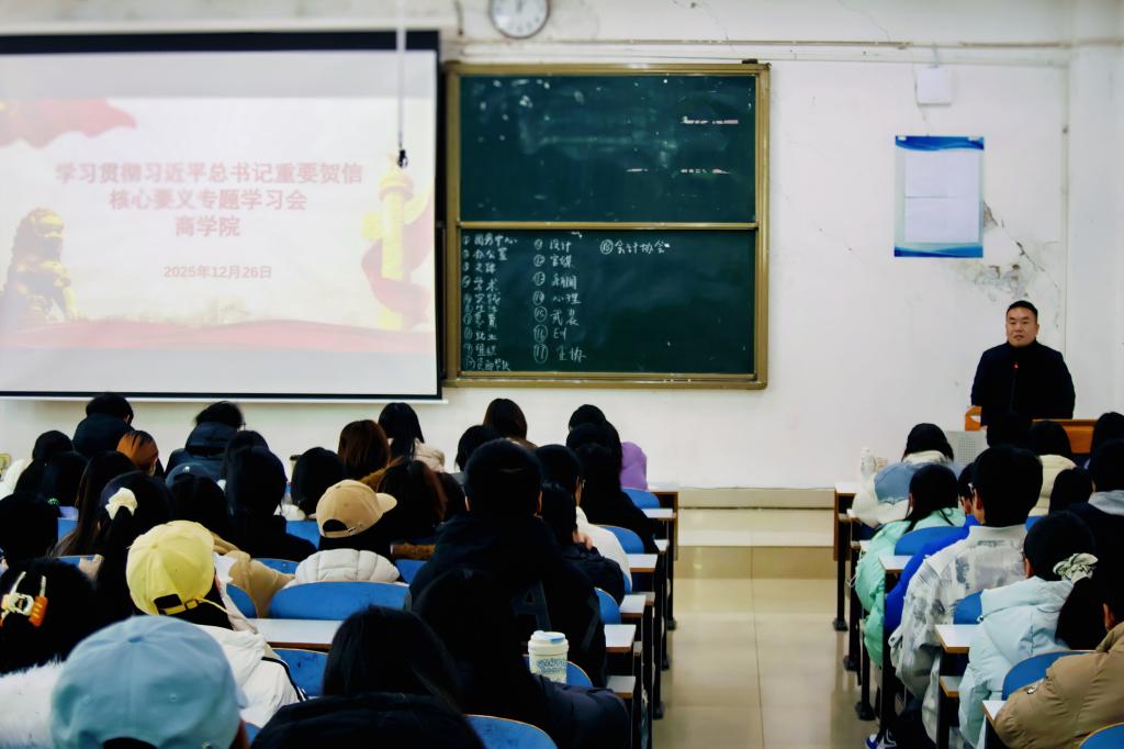 为深入领会习近平总书记重要贺信的核心要义,切实推动志愿服务精神落地生根,2025年12月26日,91社区 于经管楼103教室召开学习贯彻习近平总书记重要贺信核心要义专题学习会。本次会议由团委老师盛海组织召开,学院学生代表参与学习。