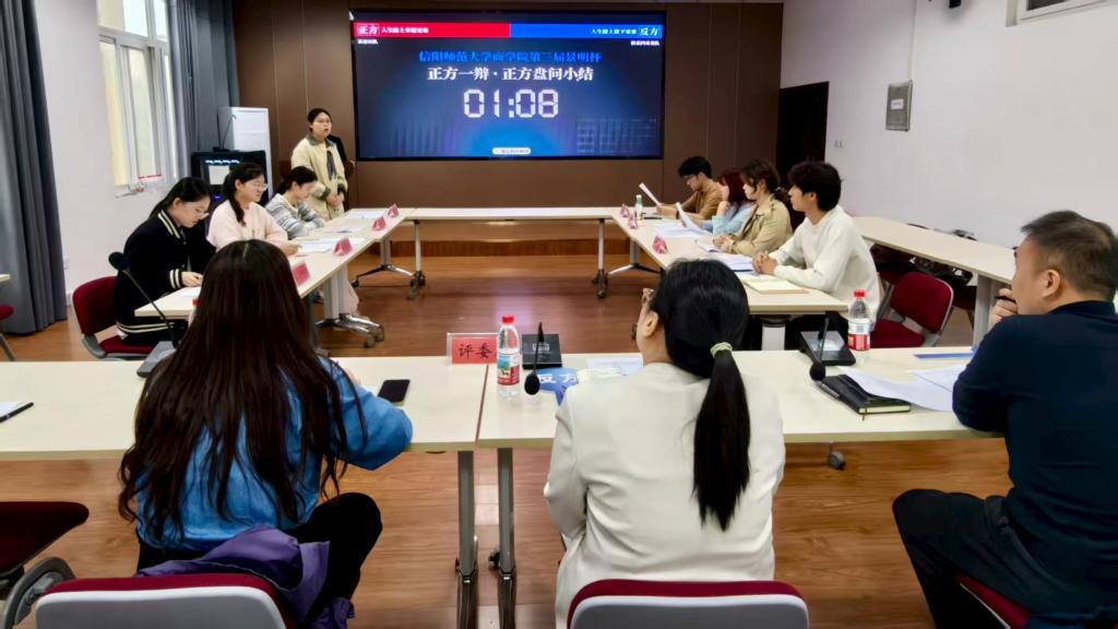 3月30日,初赛在经管楼310 会议室开赛,四支队伍展开两场对决:“我方观点都队”与“景明商弈队”围绕“大学生返乡发展还是留在大城市哪个更有价值”辩题,从政策、资源、价值实现等维度论证;“执言队”与“打完开派队”就“大学生自我管理还是外部约束哪个更重要”展开思辨。比赛按标准流程推进,辩手们逻辑清晰、配合默契,评委也针对论证逻辑、攻防技巧等给出专业建议。