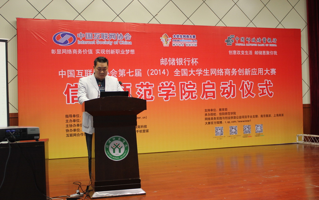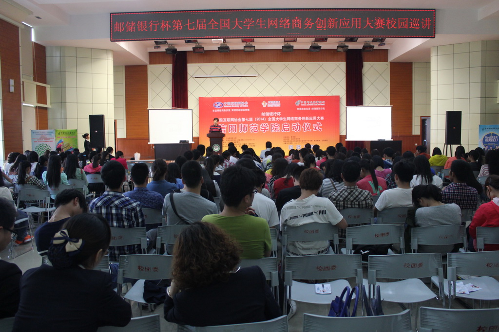 4月29日,邮储银行杯第七届大学生网络商务创新应用大赛校园巡讲在信阳师范学院逸夫楼报告厅隆重举行 ,莅临本次活动的有经济学院党委副书记房加帅,团总支书记张海霞,陈颢文等老师,中国邮政储蓄银行信阳分行副行长沈德武,企业教官代表王经纬,以及经济学院三百余名同学。