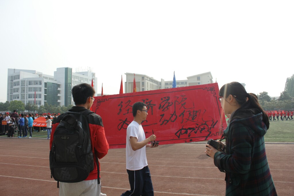 学生徐东普边走边挥洒文墨为运动健儿加油!