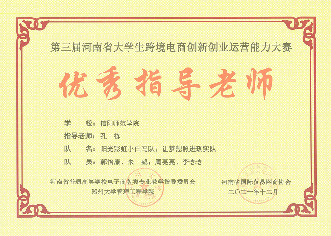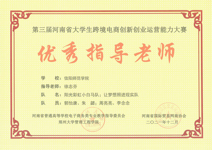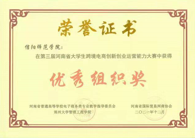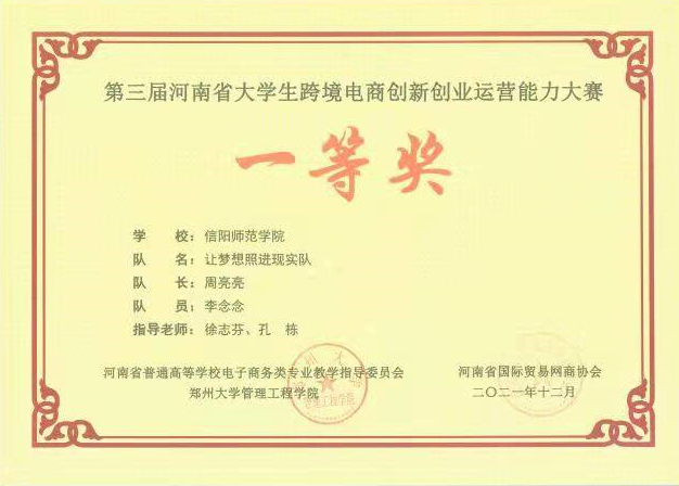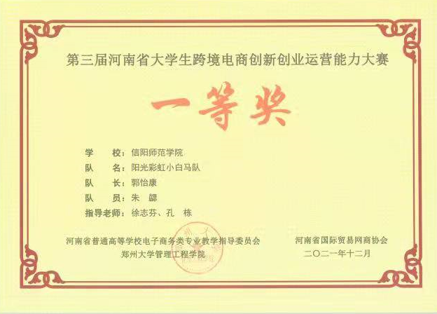 近日,第三届河南省大学生跨境电商创新创业运营能力大赛圆满落幕,91社区 “阳光彩虹小白马”和“让梦想照进现实”两支代表队分别荣获一等奖,徐志芬、孔栋两位老师分别荣获“优秀指导老师”,并荣获“优秀组织奖”。