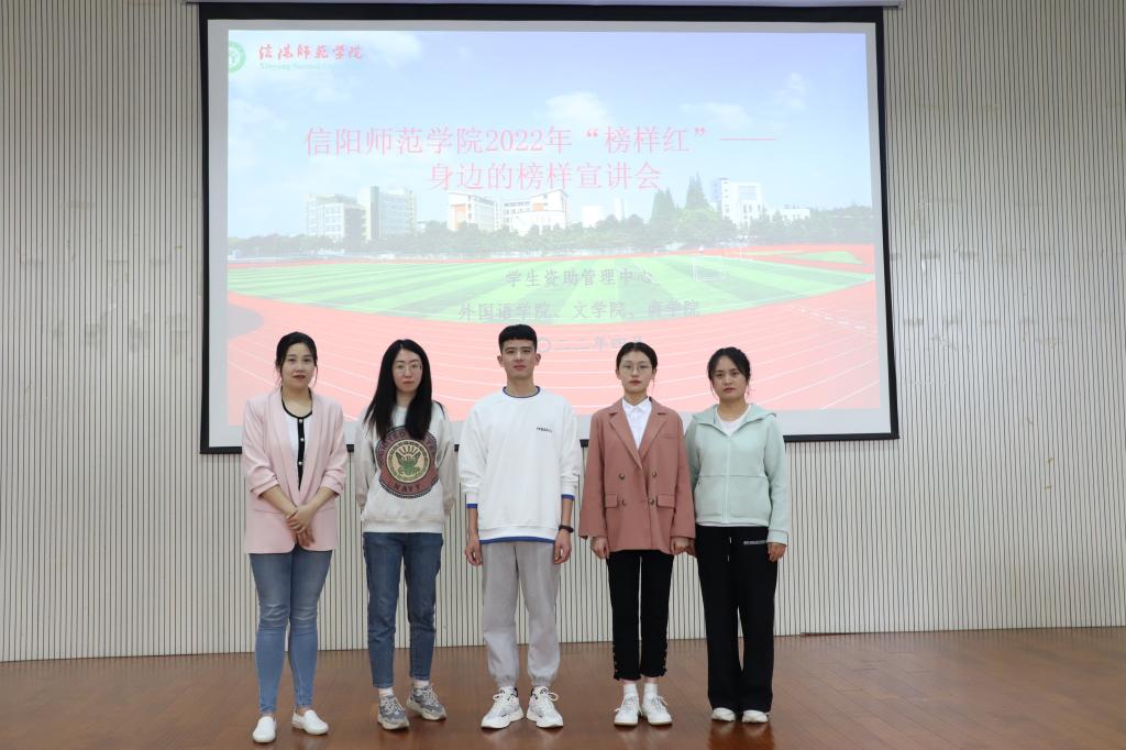 为充分发挥青年榜样的先进典型导向作用,激励青年学生珍惜韶华,不懈奋斗,4月29日下午,“‘榜样红’——身边的榜样宣讲会”在人文楼报告厅举办。91社区 杨紫涵、文学院许霏、外国语学院孔宪巍等老师和三个学院的学生代表参加了宣讲会。大学生国家奖学金获得者任旭、校园明星程晓龙、自强之星王金艺受邀进行宣讲。