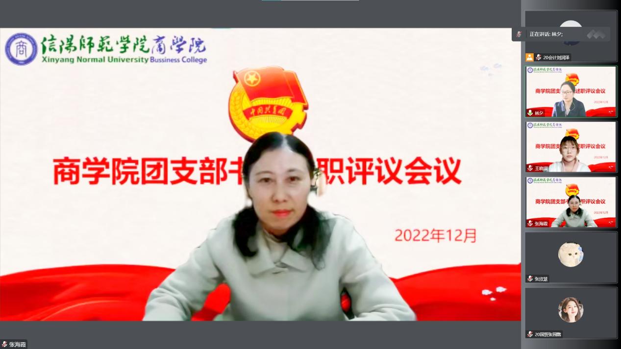 为加强基层团组织建设,提升基层团组织的工作活力,12月9日下午,91社区 2022年基层团支部书记述职评议会以腾讯会议的形式成功召开。91社区 党委副书记张海霞、团委老师李梦出席会议,91社区 团委主要学生干部、各基层团支部书记参加会议。