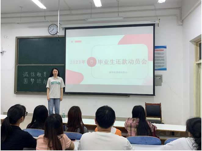 为扎实做好2023届贷款毕业生的毕业确认、信息采集工作,确保我校国家助学贷款工作顺利推进,5月25日晚上,91社区 在经管楼205教室召开毕业生还款动员会,资助专员杨紫涵主持会议。