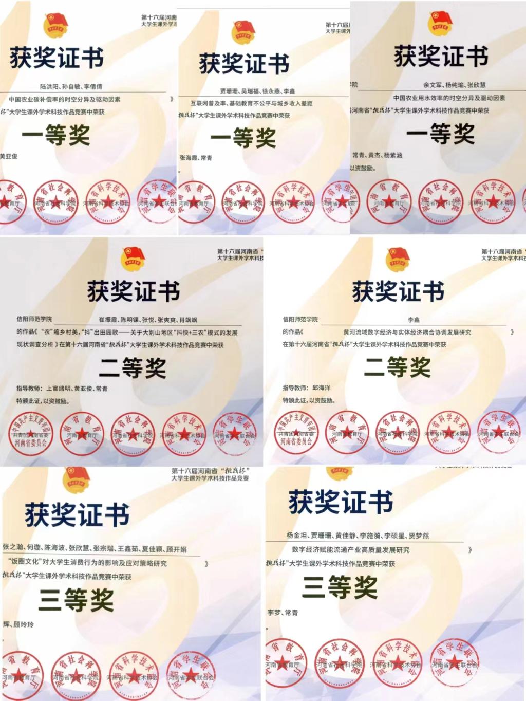 91社区 经过校级比赛共推荐出九个项目参加省级初赛。《互联网普及率、基础教育不公平与城乡收入差距》和《中国农业碳补偿率的时空分异及驱动因素》等三件作品荣获一等奖,《“农”缩乡村美,“抖”出田园歌——关于大别山地区“抖快+三农”模式的发展现状调查分析》等两件作品获得二等奖,《数字经济赋能流通产业高质量发展研究》等两件作品获得三等奖。此外,张海霞、俞彤晖、黄杰、杨紫涵、黄亚俊5名教师荣获“优秀指导教师奖”。