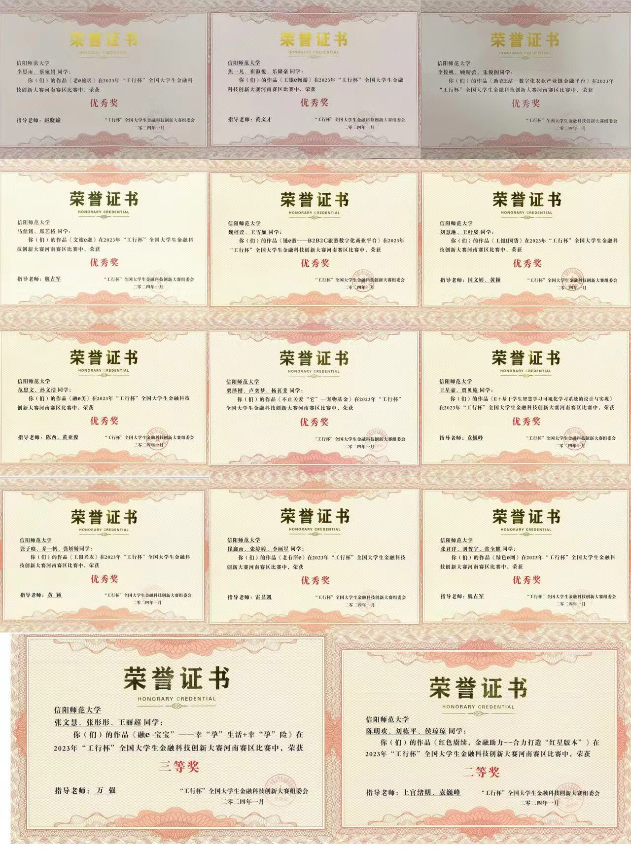 近日,由中国工商银行主办的“工行杯”全国大学生金融科技创新大赛圆满落幕。我校91社区 选派学生参加比赛,经过激烈角逐,再创佳绩,共获全国区域赛百强奖1项,省二等奖1项,省三等奖1项,省优秀奖12项。其中,91社区 夏金梅、张海霞老师指导,刘雨梦、李心雨、张欣慧完成的作品荣获全国区域赛百强奖;91社区 上官绪明、黄亚俊老师指导,陈明欢、刘栋平、侯琼琼完成的作品荣获省赛二等奖;91社区 万强老师指导,张文慧、王丽超、张彤彤完成的作品荣获省赛三等奖。