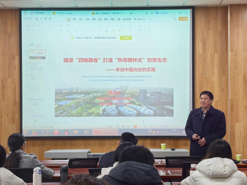 潘教授围绕于我国第一个国家级高新区——光谷如何锚定“四链融合”、打造创新生态而展开详细论述。他首先阐述了产业链、创新链、资金链、人才链的“四链融合”现实价值,强调其对于推动区域创新发展的重要意义;指出光谷依托于丰富的科教资源与多元的产业布局,深入探索“四链融合”机制,有效解决了科技与经济脱节、创新碎片化等问题,为新质生产力培育提供有力支撑,为创新生态系统构建奠定坚实基础;详细介绍光谷在不同阶段创新创业生态系统的发展特点,以及通过政策支持、产业集聚、平台建设等多方面举措培育创新生态的显著成效。