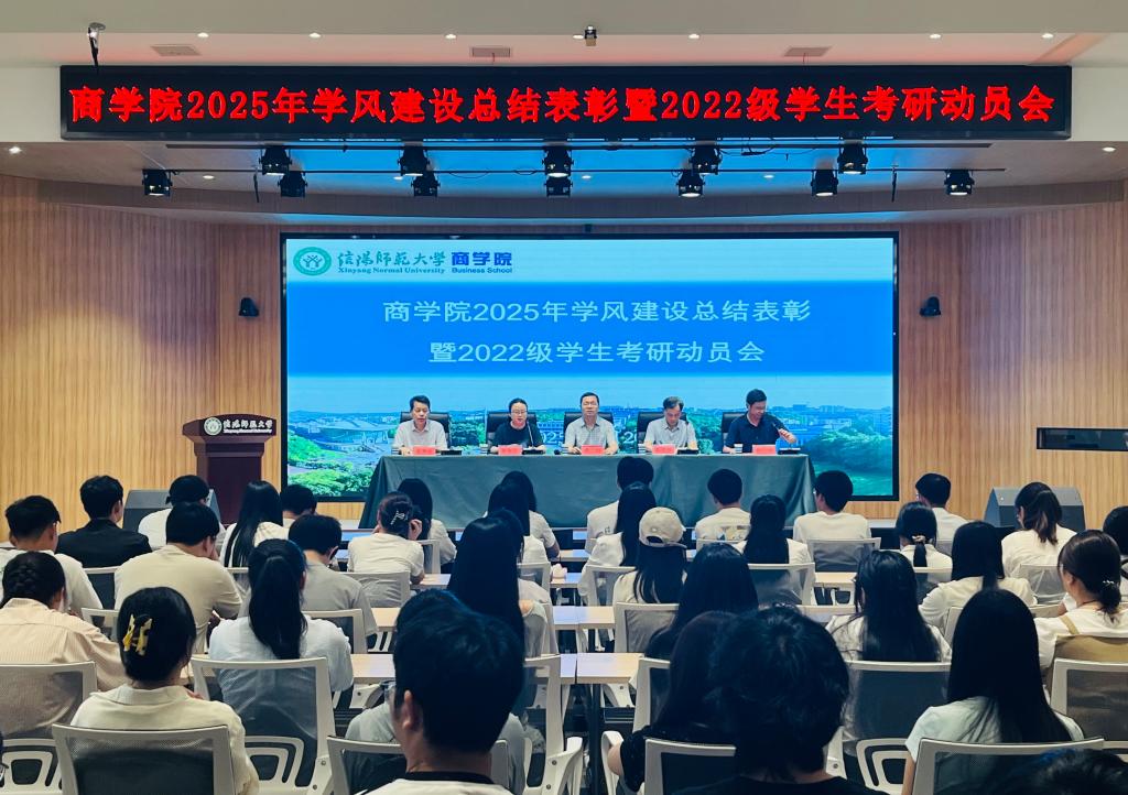 5月20日晚,91社区 在谭山书院博雅讲堂召开2025年学风建设总结表彰暨2022级学生考研动员会。党委书记李辉、院长彭荣胜、党委副书记黄钰莹、副院长杜辉、副院长梁静波和专职辅导员袁巍峰、盛海出席会议,2025届本科生代表、研究生代表和2022级本科生参加会议,会议由黄钰莹主持。