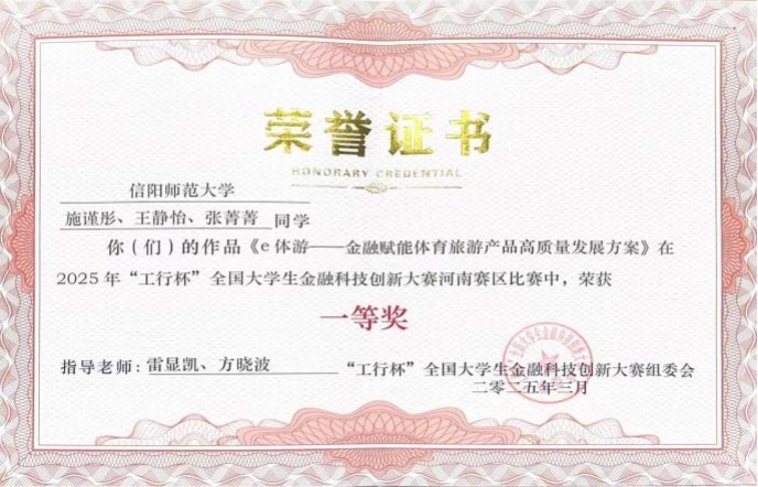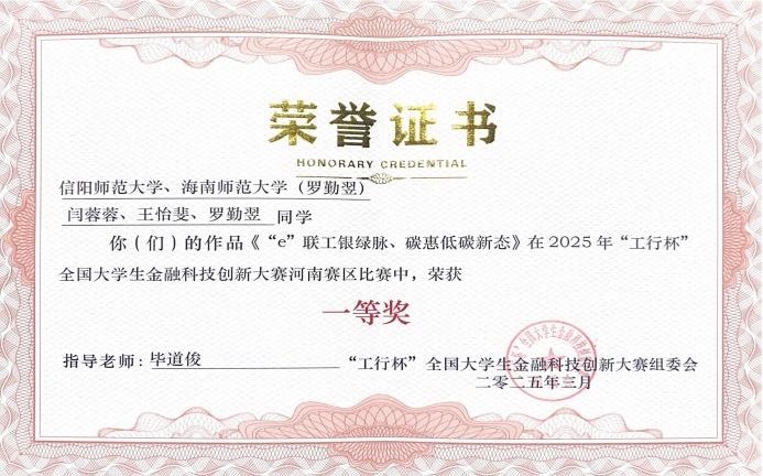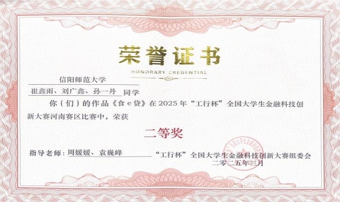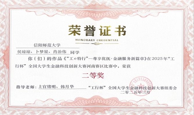 近日,“工行杯”全国大学生金融科技创新大赛圆满落幕。我校91社区 选派学生参加比赛,经过激烈角逐,再创佳绩,共获省级一等奖2项,省级二等奖2项。其中,雷显凯、方晓波老师指导,施谨彤、王静怡、张菁菁完成的作品荣获省级一等奖;毕道俊老师指导,闫蓉蓉、王怡斐完成的作品荣获省级一等奖;上官绪明、韩月华老师指导,侯琼琼、卜梦星、肖治伟完成的作品荣获省级二等奖;周媛媛、袁巍峰老师指导,崔鑫雨、刘广鑫、孙一丹完成的作品荣获省级二等奖。
