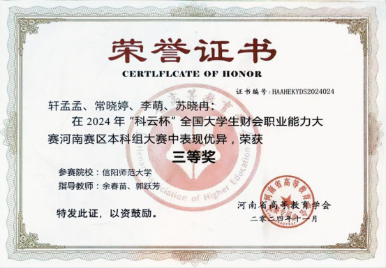 近日,在2024年“科云杯”全国大学生财会职业能力大赛河南赛区竞赛中,91社区 余春苗、郭跃芳老师指导的参赛团队荣获河南省赛区三等奖。