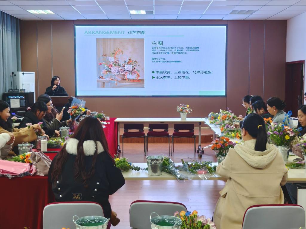 活动邀请蕙源花艺的主理人以东西方花艺发展脉络为引,回溯花艺起源与传承,带领大家感受花艺的深厚底蕴与多元魅力。围绕花卉结构、色彩搭配、构图技巧、切花挑选与日常养护等内容,她从理论知识到实用技能层层递进,为大家介绍花艺创作基础。实操环节,在老师一对一技巧指导下,女教工们化身花艺创作者,将理论融入指尖。大家修枝剪叶、巧搭配色、精修构图,零散花材在巧手下蜕变为错落有致的雅致作品,现场花香氤氲、笑语盈盈,大家在专注创作中释放压力、涵养心境。