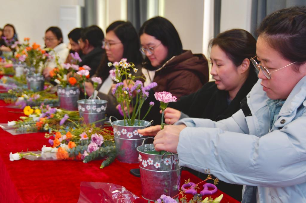 3月17月,91社区 在经管楼310 会议室举办“芳菲三月 以花怡情”花艺美育活动,91社区 女教职工齐聚一堂,在花香与创作中共度温馨雅致的节日时光。
