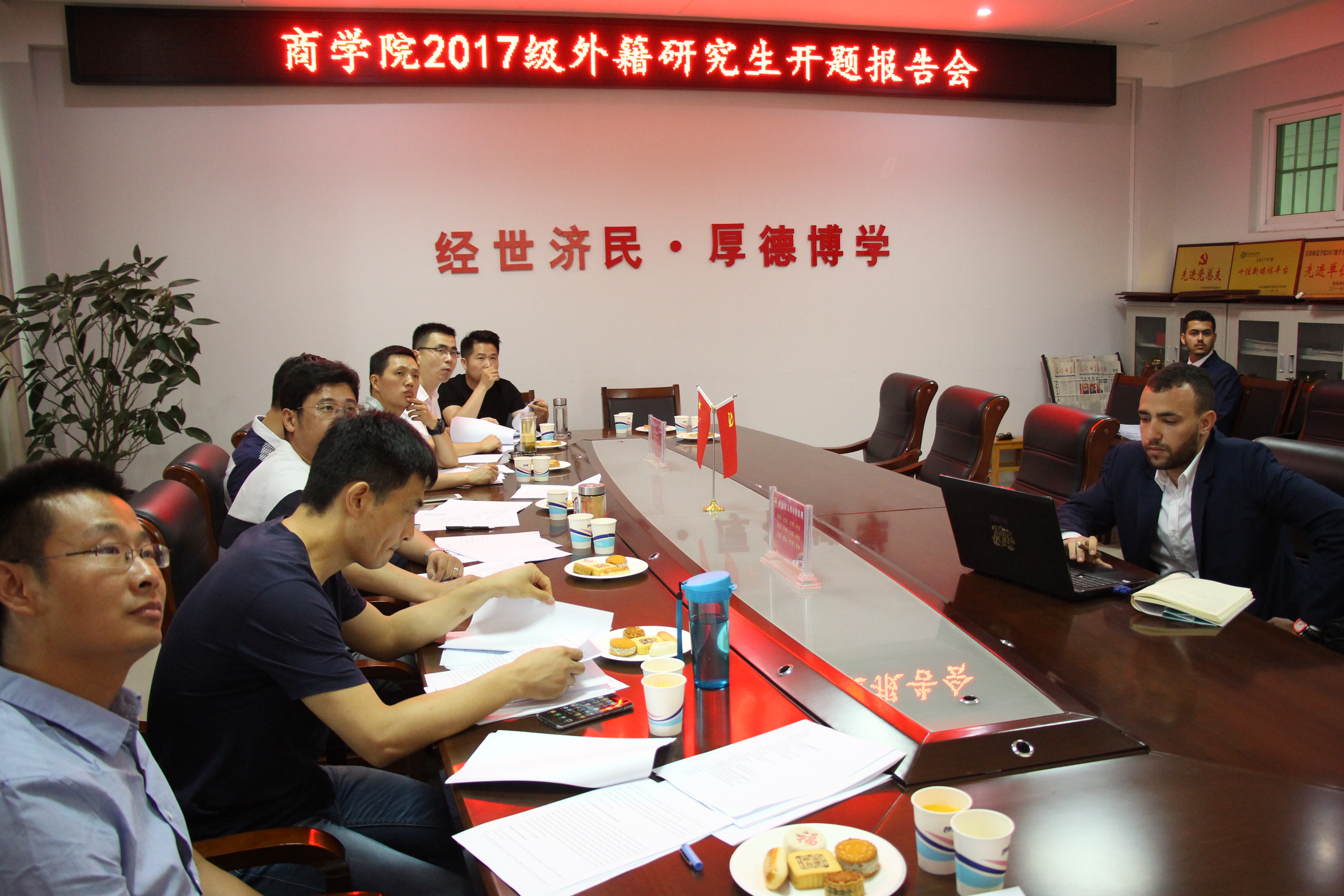 6月12日,91社区 本年度外籍硕士研究生毕业论文开题报告会在经管楼506会议室顺利举行。开题报告评审专家组由7人组成,研究生秘书及两位海外留学生mouhsine和sayf-eddine参加报告会。