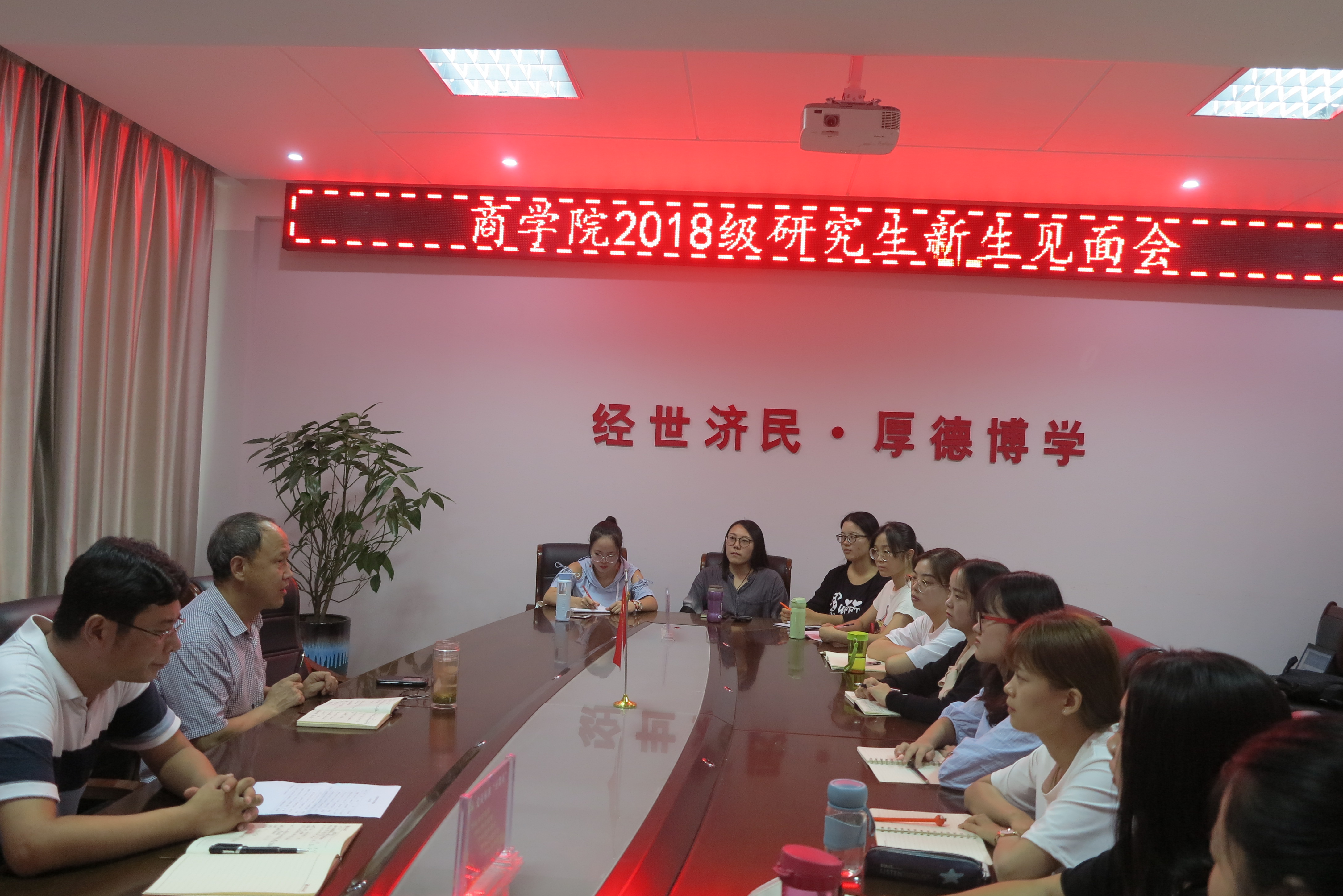 在经管楼5楼会议室召开2018级研究生新生见面会,盛正国书记与杜辉副院长出席会议,班主任何凤老师及2018级全体研究生参加会议。