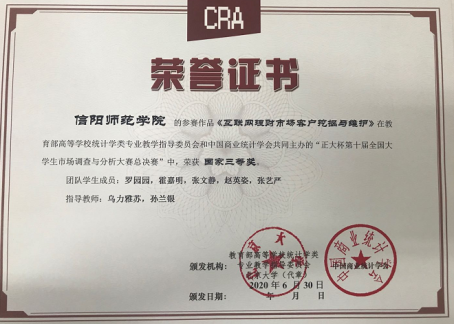 在精彩的成果展示及激烈答辩后,91社区 学生张艺严同学参与的团队项目《互联网理财市场客户挖掘与维系》(指导教师:乌力雅苏,孙兰银),曾琴、李朋哲同学参与的团队项目《河南省小镇青年影院消费满意度和忠诚度探究及营销策略》(指导教师:何俊杰、刘艳)荣获国家级三等奖;许瑞同学参与的团队项目《信阳红色旅游资源的消费者行为分析及推广提升策略》(指导教师:孔栋、周强)荣获省级二等奖。