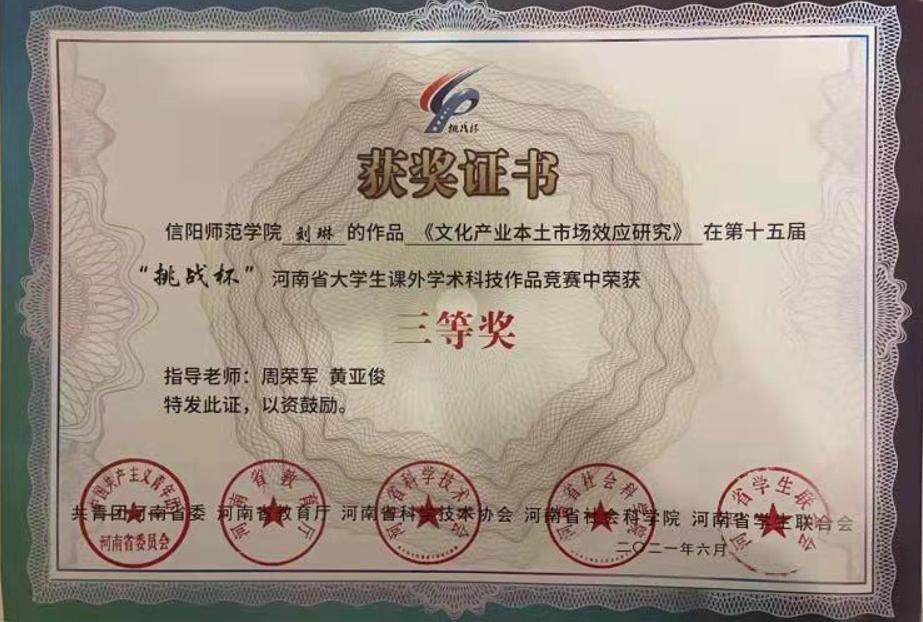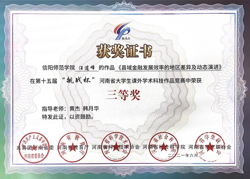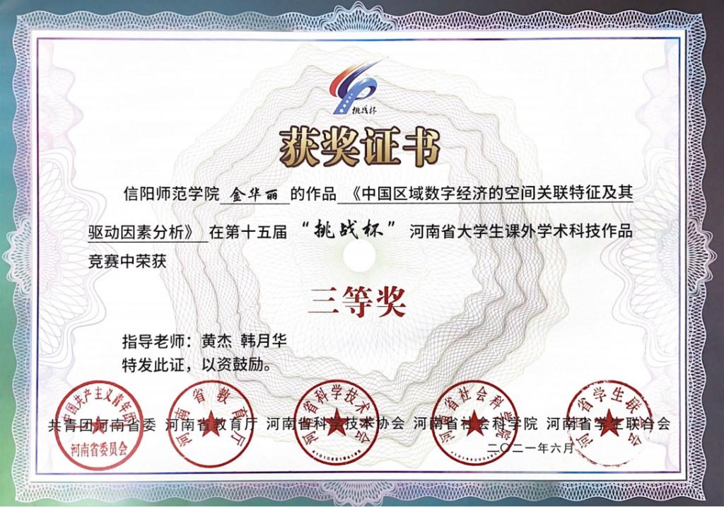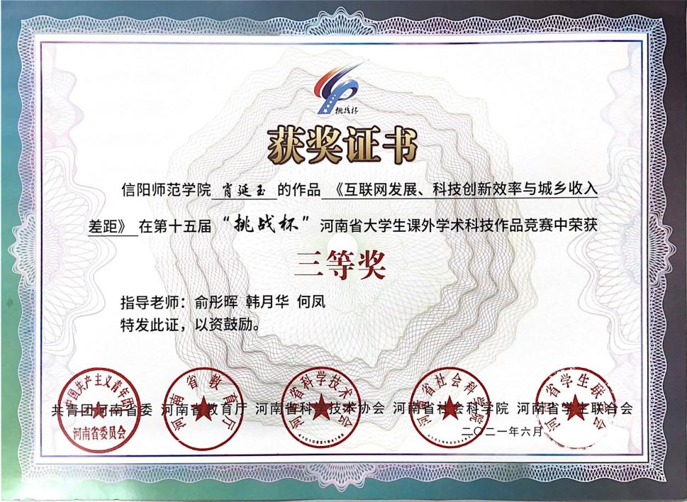 近日,共青团河南省委公布了第十五届“挑战杯”河南省大学生课外学术科技作品竞赛获奖名单,91社区 有6个参赛项目获奖。其中,许瑞等5名同学的参赛项目《能带走的古色古香——河南省物质文化遗产文创产品的消费者购买意愿分析》荣获一等奖,孙自敏的《中国种植业碳生产率的区域差异及分布动态演进》荣获二等奖,肖延玉的《互联网发展、科技创新效率与城乡收入差距》、汪道峰的《县域金融发展效率的地区差异及动态演进》、金华丽的《中国区域数字经济的空间关系关联特征及驱动因素分析》、刘琳的《文化产业本土市场效应研究》等4个作品荣获三等奖。