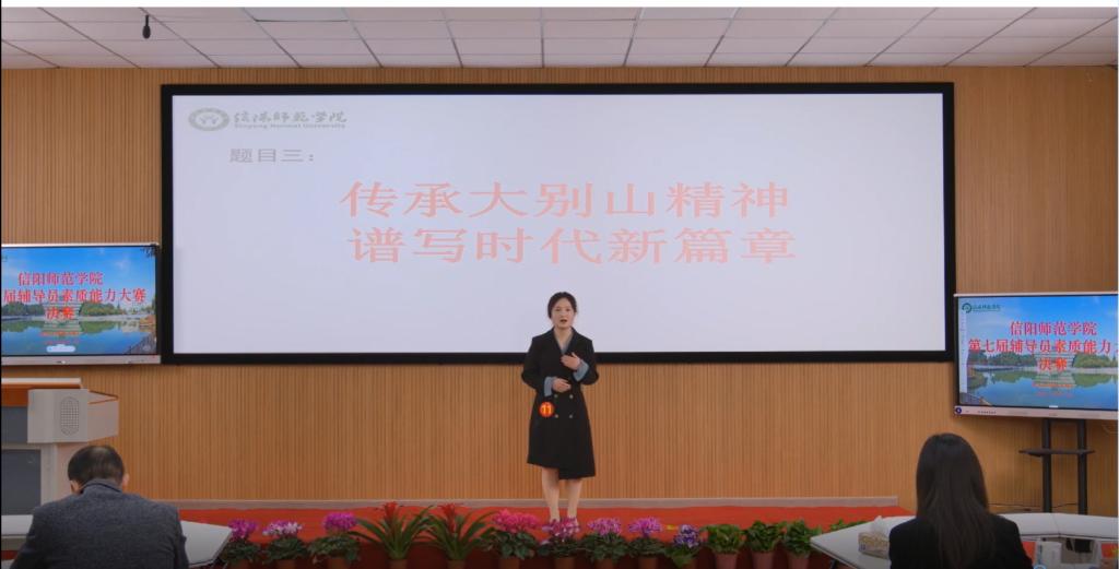 本次大赛由信阳师范学院学生工作处(部)主办,全校近百名辅导员参加。经过初赛环节的基础理论知识测试、案例研讨和谈心谈话三个项目的激烈角逐,12名辅导员脱颖而出,晋级决赛。决赛分为案例分析和理论宣讲两个项目。在案例分析阶段,选手们以AB角问辩的形式围绕案例体现的问题本质、解决路径、实施方法及相关启示等进行了细致阐述。在理论宣讲环节,选手们以扎实的理论基础、饱满的精神状态和富有感染力的语言围绕主题进行宣讲。在决赛中,12名选手案例分析合理到位,处理问题正确得当,理论阐释精准精辟,语言表达清晰流畅,展现了我校辅导员队伍良好的精神风貌和过硬的综合素质。