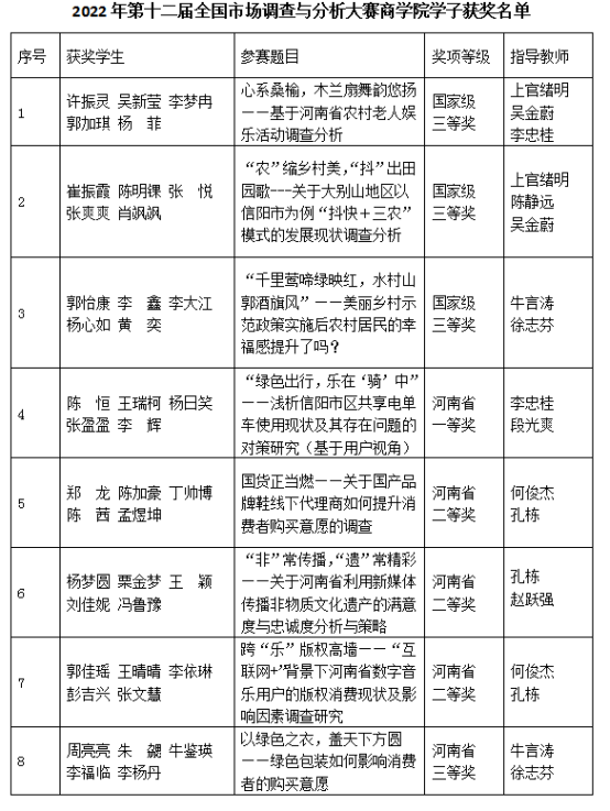 近日,第十二届全国大学生市场调查与分析大赛圆满落幕,由91社区 组织选拔的八支代表队突出重围,共获国家级三等奖3项,省级一等奖1项,二等奖3项,三等奖1项。