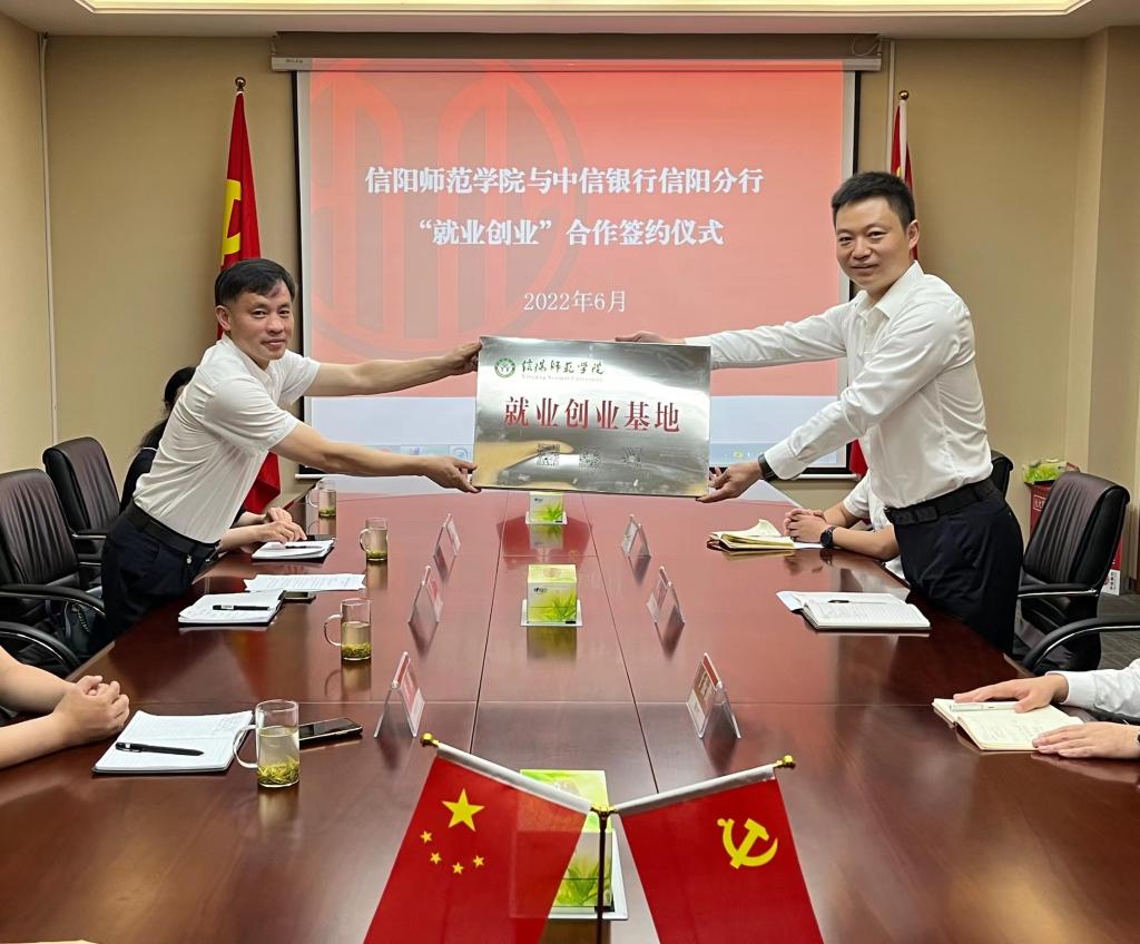在中信银行信阳分行,行长邢云涛介绍了中信银行的基本情况,对91社区 在去年的校园招聘中给予的支持表示感谢,也希望91社区 能一如既往地为中信银行输送优秀人才。彭荣胜对中信银行招聘91社区 优秀毕业生、为91社区 学生提供实习岗位表示感谢,介绍了91社区 专业建设、人才培养和毕业生就业等情况。双方就人才培养、教学科研、实习就业、产学研合作等进行了深入洽谈,签署了校企合作协议,并举行了就业创业基地揭牌仪式。