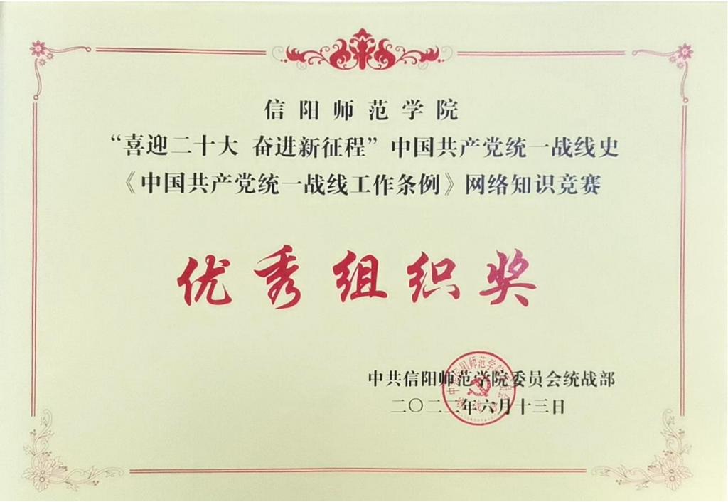 根据中共河南省委统战部、校党委统战部的统一部署,91社区 党委认真组织师生参加信阳师范学院“喜迎二十大 奋进新征程”中国共产党统一战线史和《中国共产党统一战线工作条例》网络知识竞赛,参与答题1206人次,获奖人数1081人,荣获优秀组织奖。