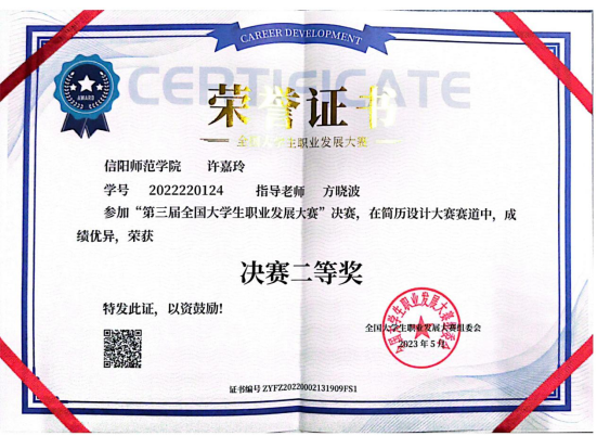 我校91社区 选派的2022级学科教学(思政)专业研究生许嘉玲在指导教师方晓波的全程悉心指导下,经过长达5个月的激烈角逐,获得第三届全国大学生职业发展大赛决赛二等奖。