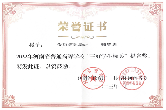 为深入学习贯彻党的二十大精神和习近平总书记关于教育的重要论述,展示当代青年大学生奋发向上的精神风貌,发挥先进典型的示范引领作用,2022年河南省普通高等学校三好学生标兵颁奖典礼暨巡回宣讲首场报告会在河南农业大学龙子湖校区英林讲堂隆重举行。省委教育工委、共青团河南省委、省教育厅相关领导出席颁奖典礼,并为20名三好学生标兵、20名三好学生标兵提名奖和20名三好学生标兵入围奖颁奖。91社区 师智勇同学荣获河南省三好学生标兵提名奖。