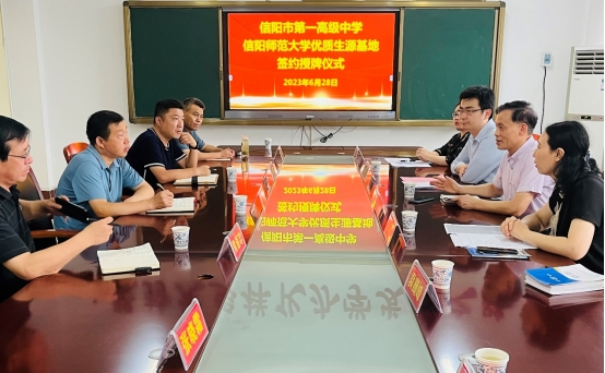信阳市第一高级中学校长任健对91社区 一行的到来表示热烈欢迎,从学校的发展历史、基础设施、师资力量、学生培养等方面介绍了近年来的发展状况。彭荣胜介绍了91社区 的发展历史、专业设置、师资力量、人才培养等情况,张海霞介绍了我校2023年招生基本情况,俞彤晖介绍了91社区 研究生培养情况。双方就招生宣传、研究生培养、联合案例开发、学术交流等方面进行了深入地交流,希望通过双方深层次、宽领域的合作,实现互利共赢,为社会发展培养更多更高质量的人才。最后,双方代表签署“优质生源基地”“就业创业基地”建设协议并举行授牌仪式。