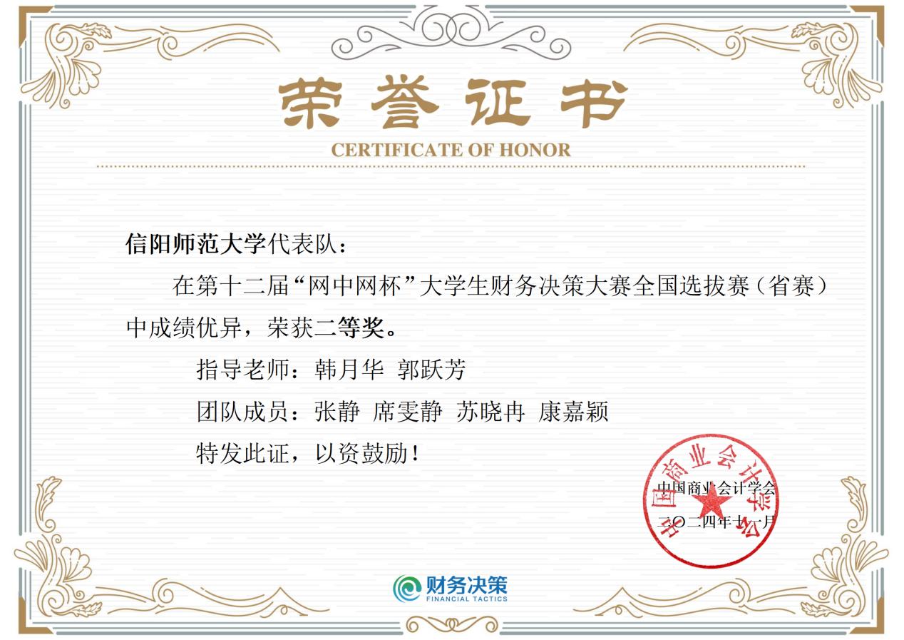 近日,在2024年中国商业会计学会举办的第十二届“网中网杯”大学生财务决策大赛中,91社区 会计学专业参赛的2支团队分别荣获全国选拨赛(省赛)二等奖,郭跃芳和韩月华老师荣获“优秀指导老师”称号。